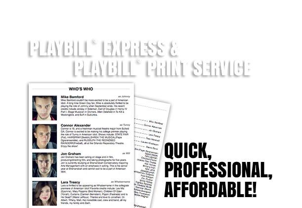Let us print, bind and deliver your Playbill program! Our print service is fast and convenient with options for all budgets. Check out our great prices. We even print promotional posters too!